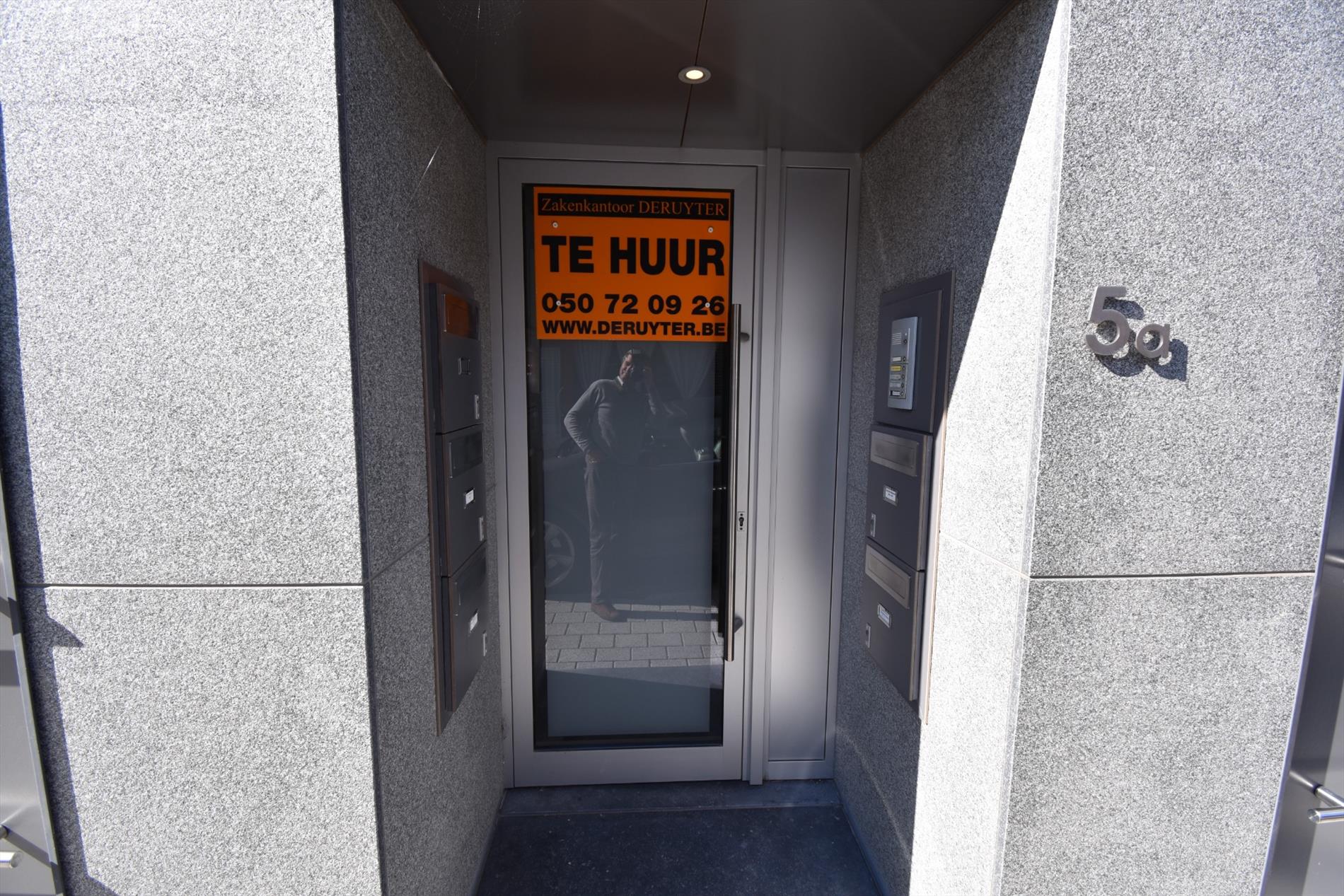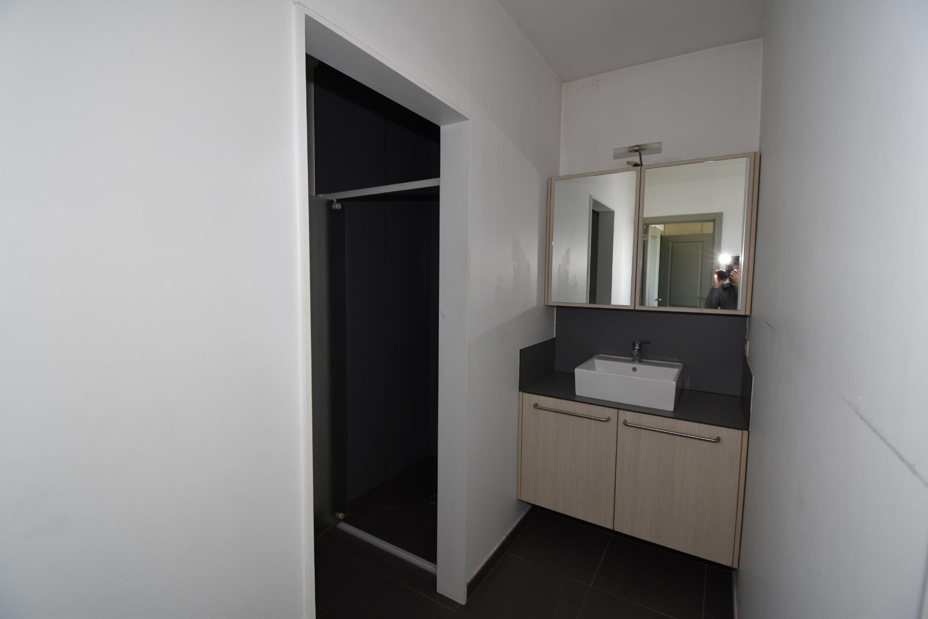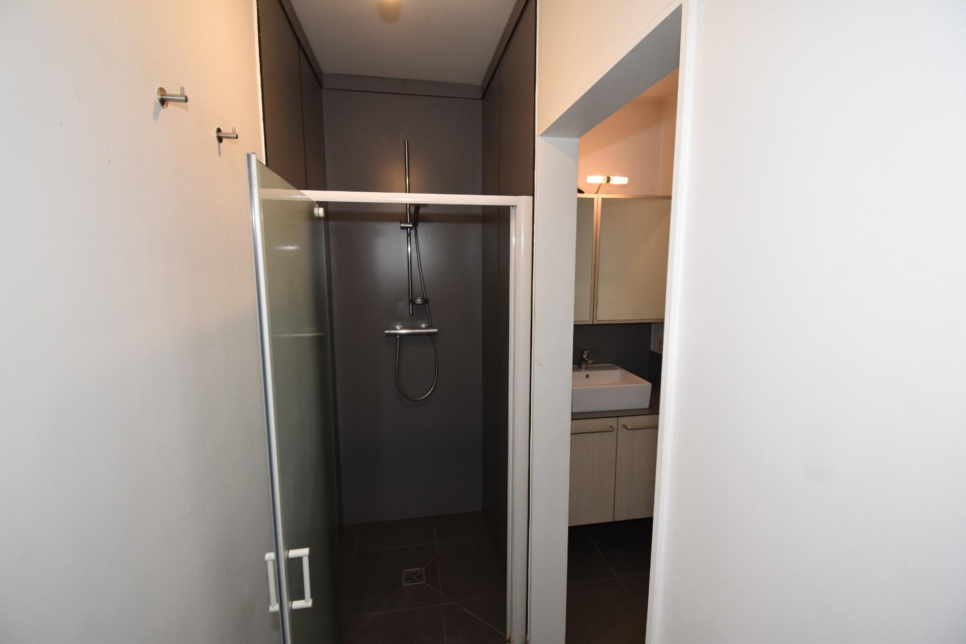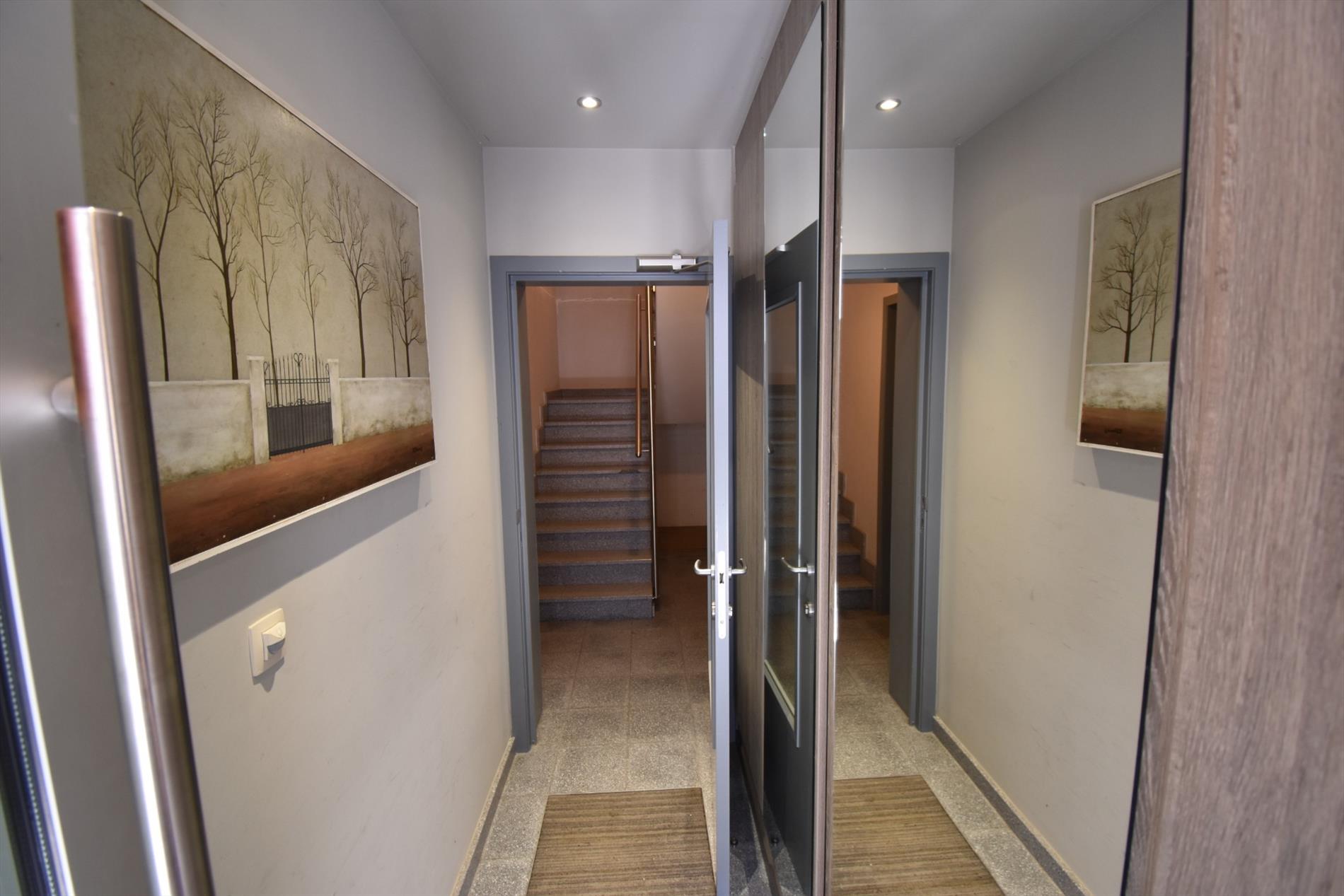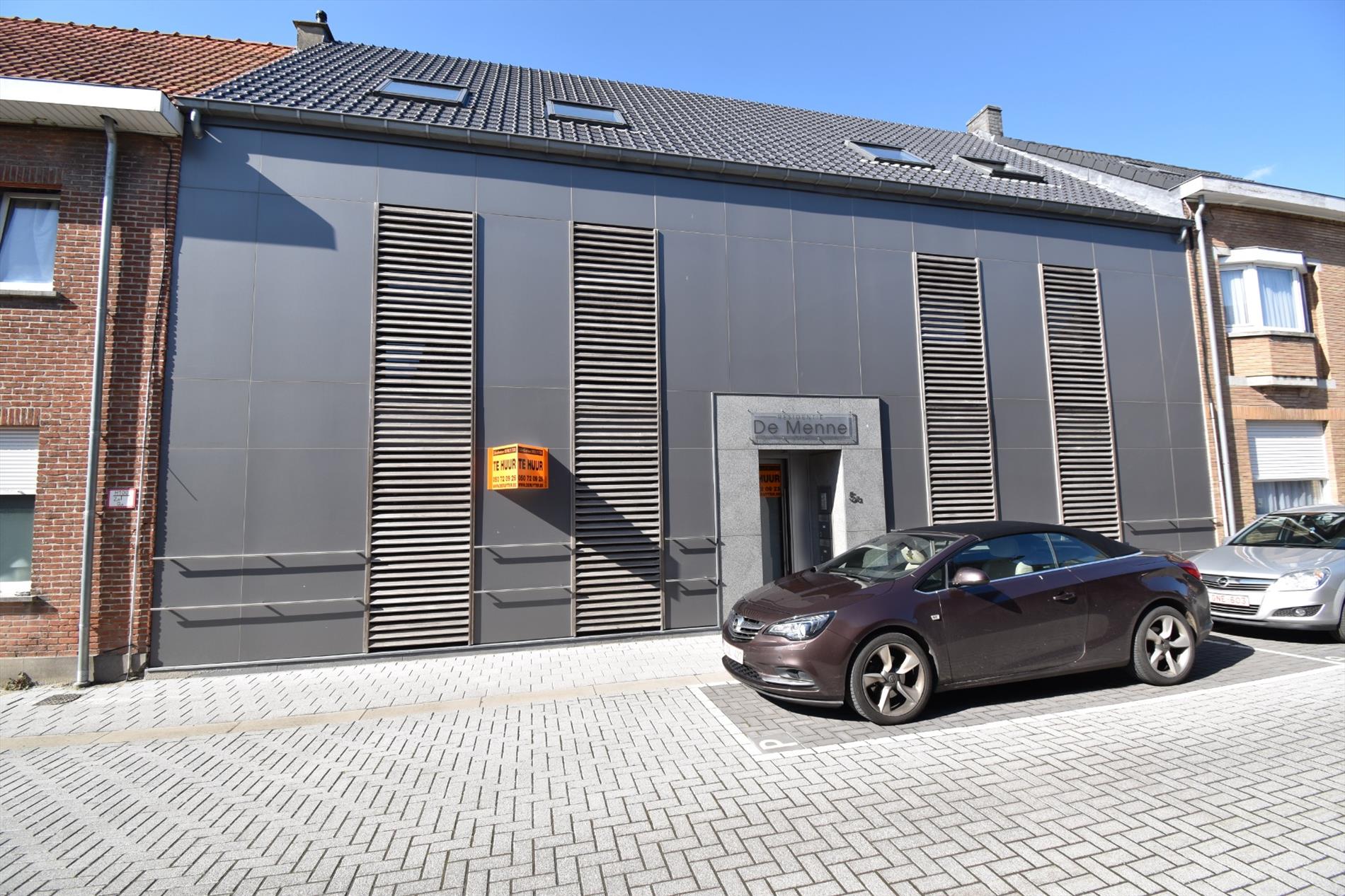 Indeling; inkom, living, met open keuken (ingericht met oven, vaatwas, frigo) met aanpalend terras, berging, badkamer met inloopdouche, lavabo en toilet, 1 slaapkamer. Achter het gebouw is er een autostaanplaats en een afgesloten garage.
