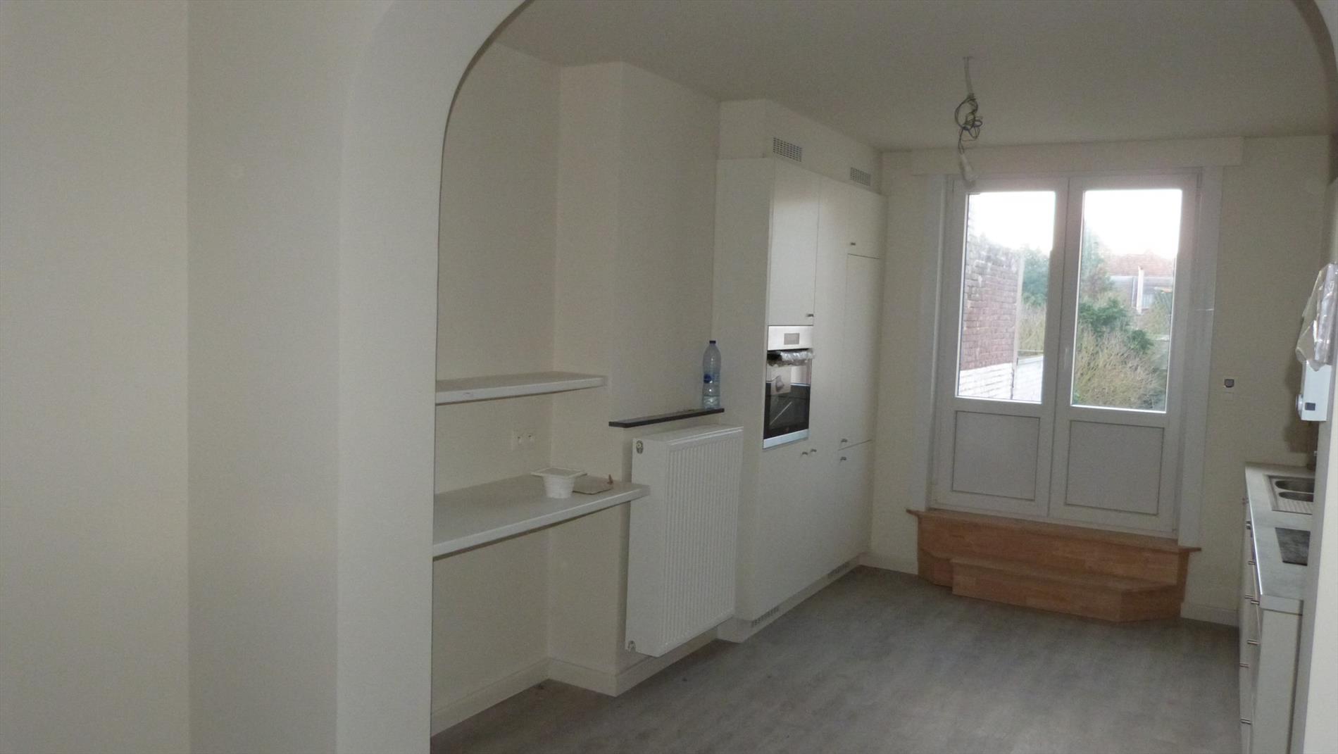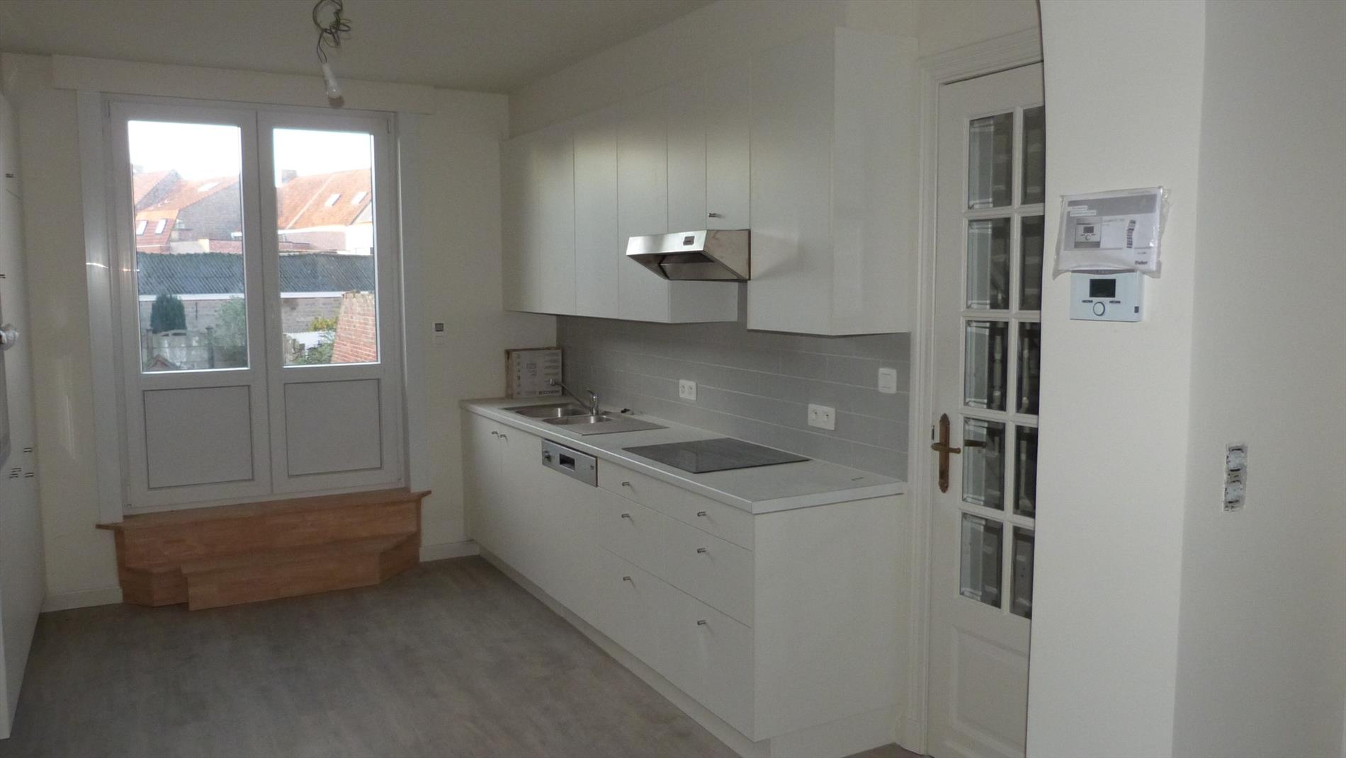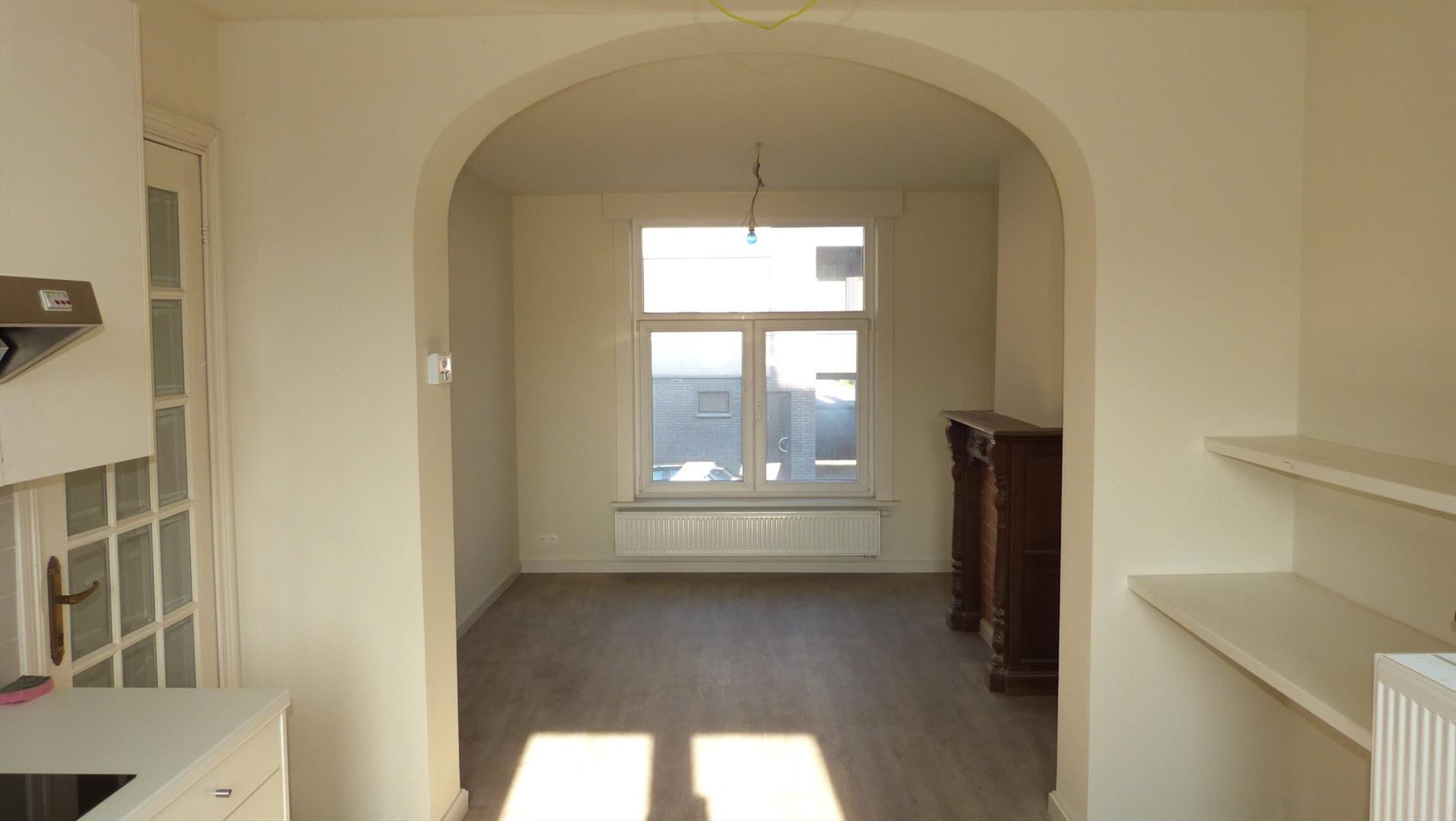 1ste verdiep: inkom, bergruimte onder trap, aparte toilet, deur die toegang heeft naar de leefruimte met open keuken. Nieuwe keuken voorzien van alle toestellen. Aan de keuken paalt een mooi terras.