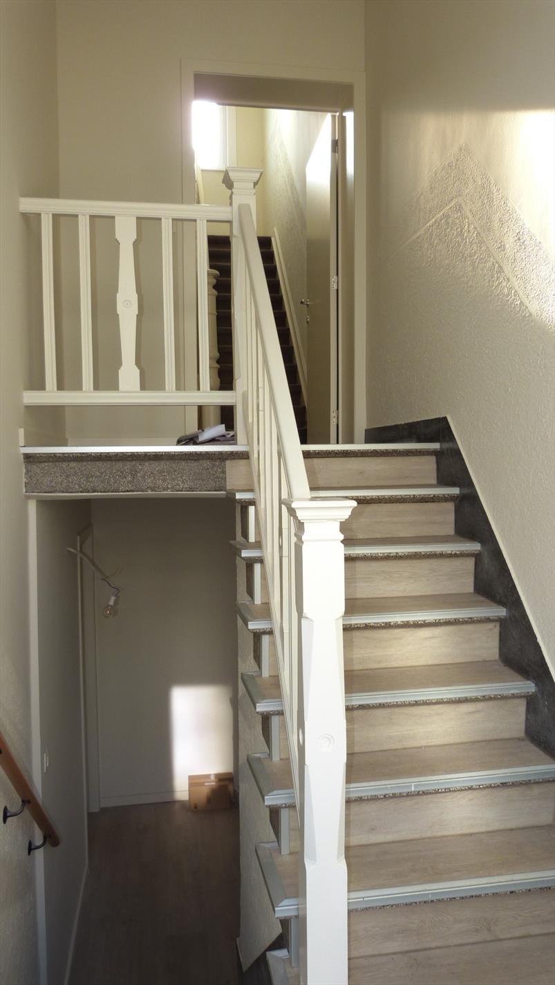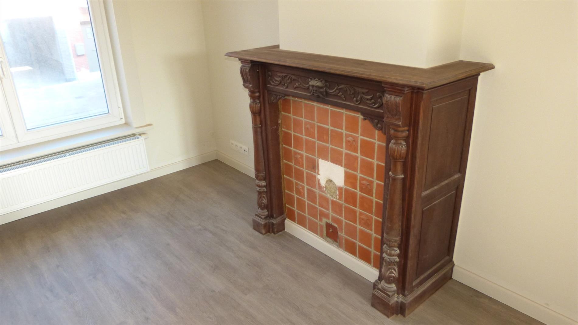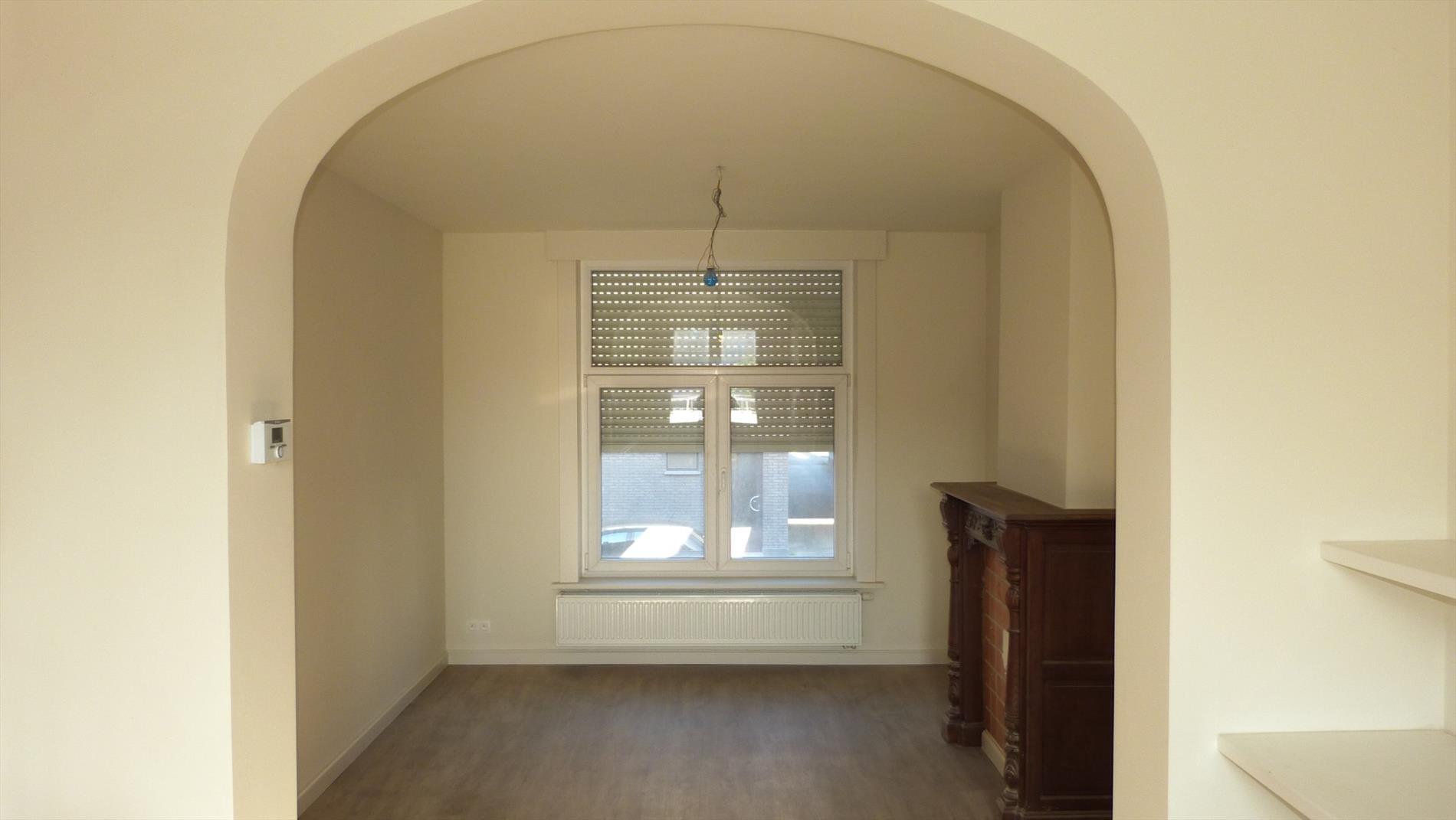 1ste verdiep: inkom, bergruimte onder trap, aparte toilet, deur die toegang heeft naar de leefruimte met open keuken. Nieuwe keuken voorzien van alle toestellen. Aan de keuken paalt een mooi terras.