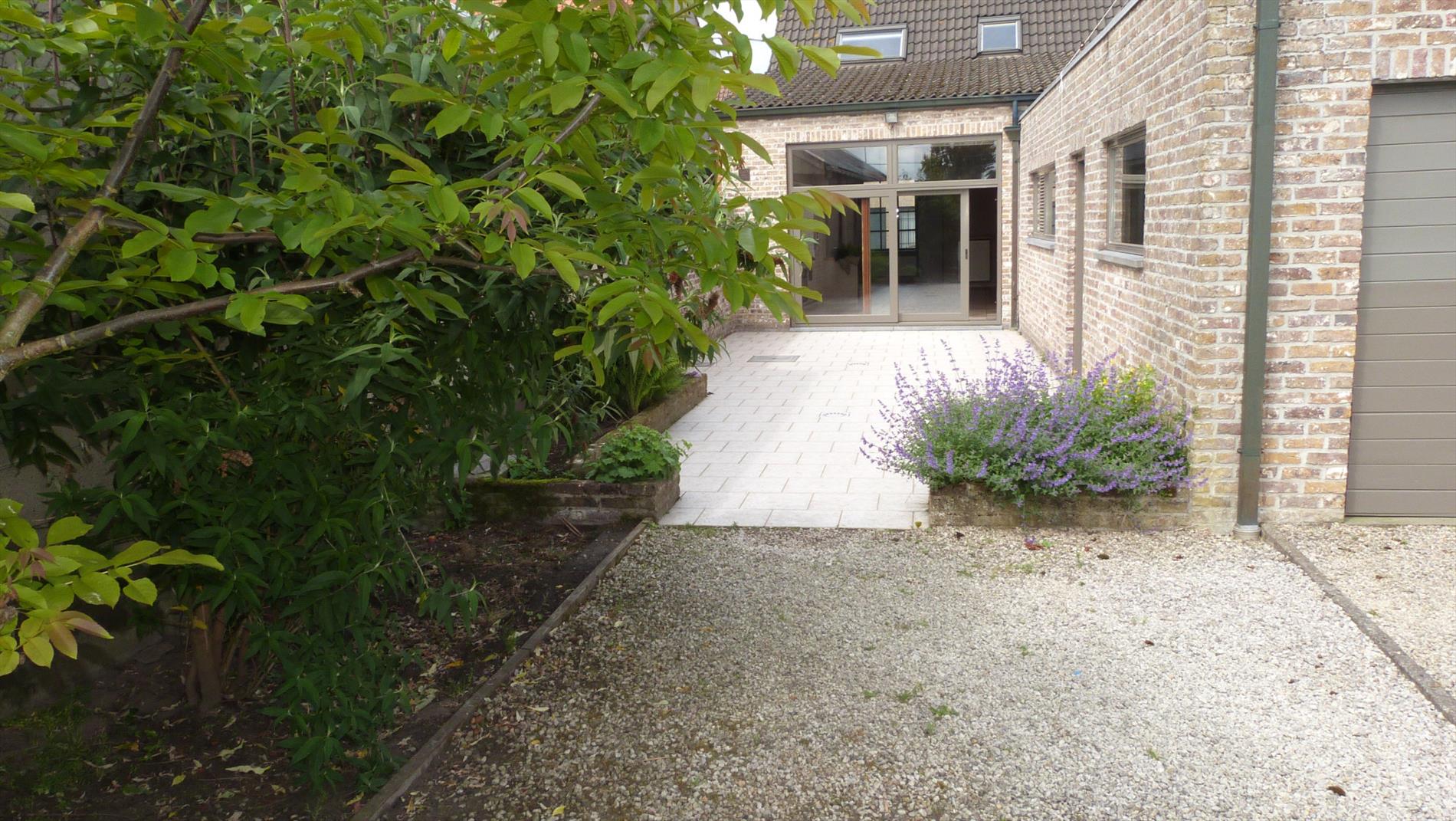 Groot terras en zonnige tuin.