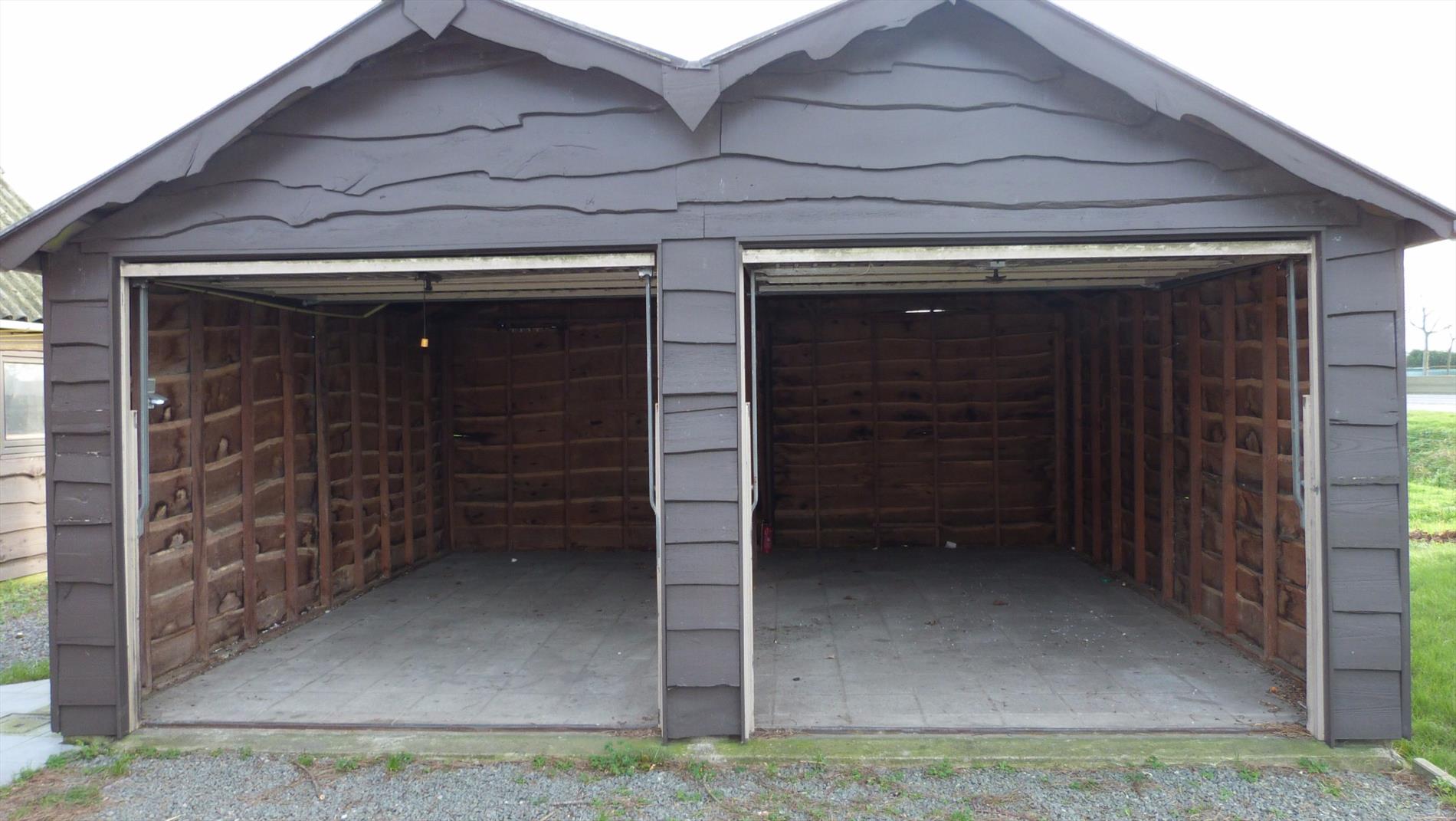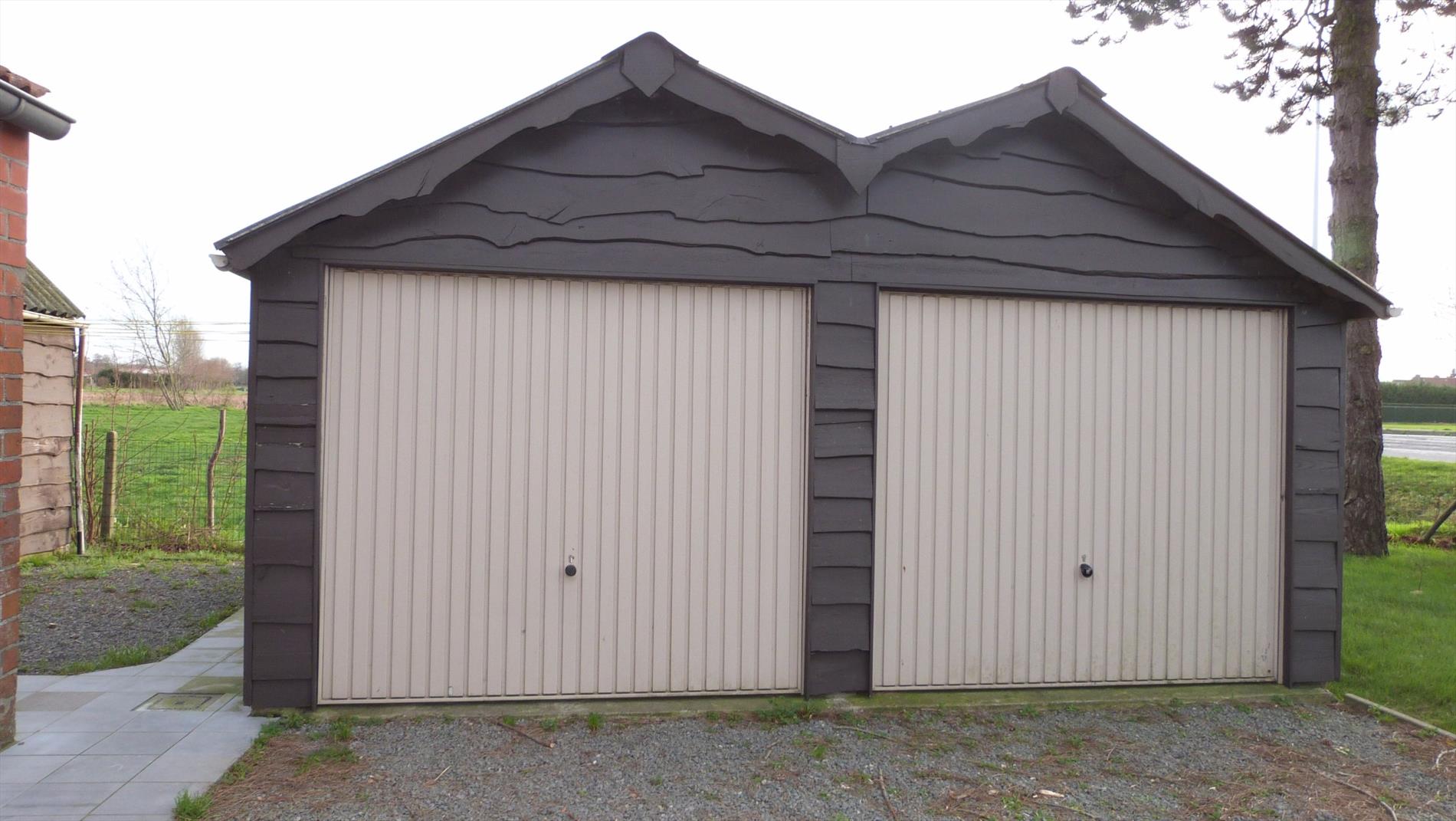 Indeling: inkom, woonkamer, eetkamer, keuken, 2 slaapkamers, badkamer, kelder, 2 garages en tuin.