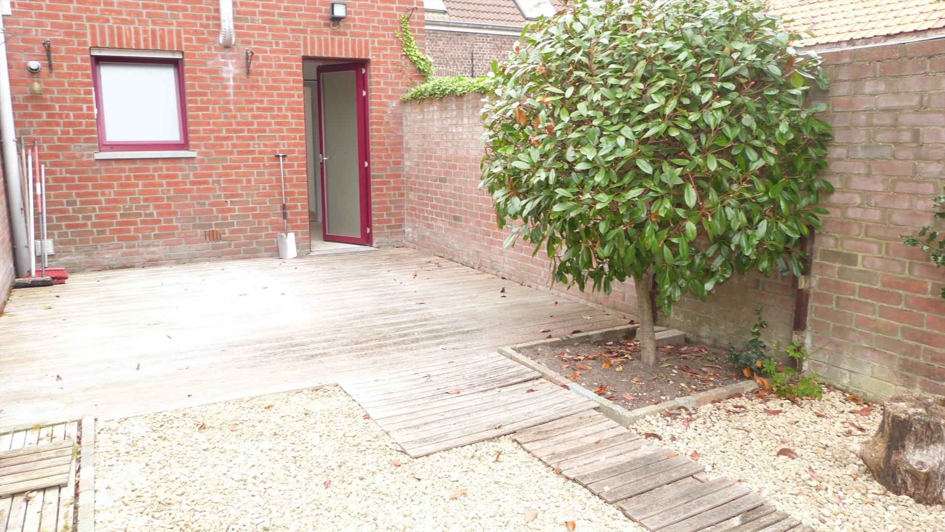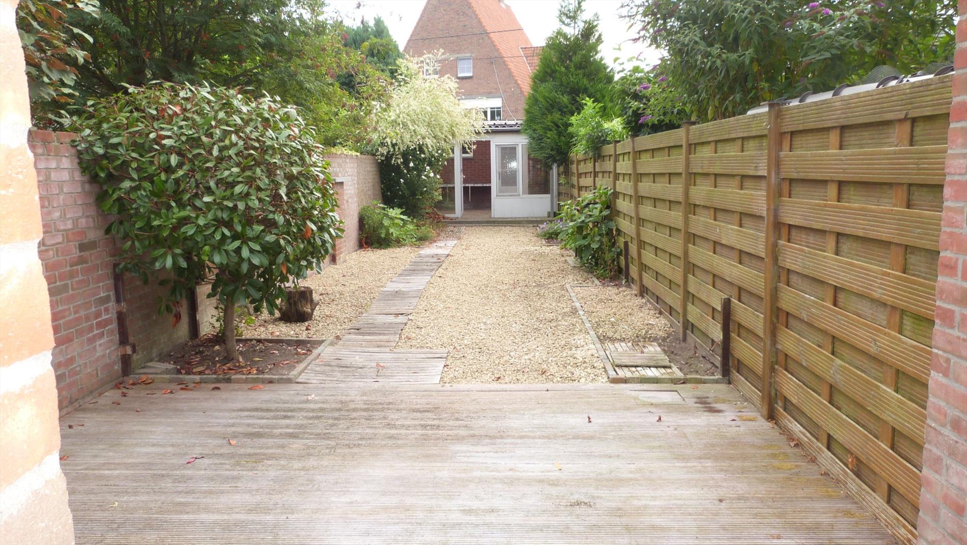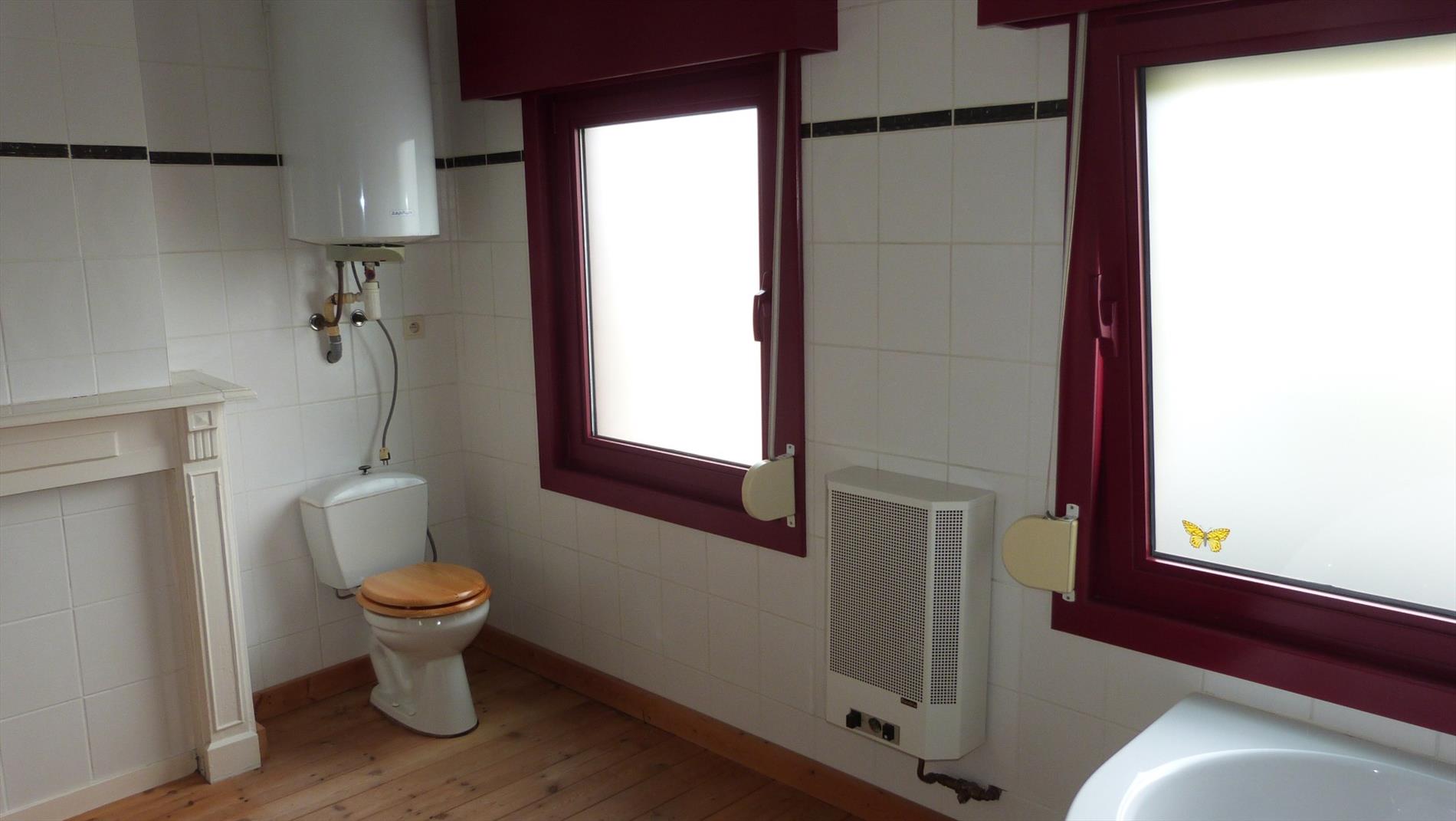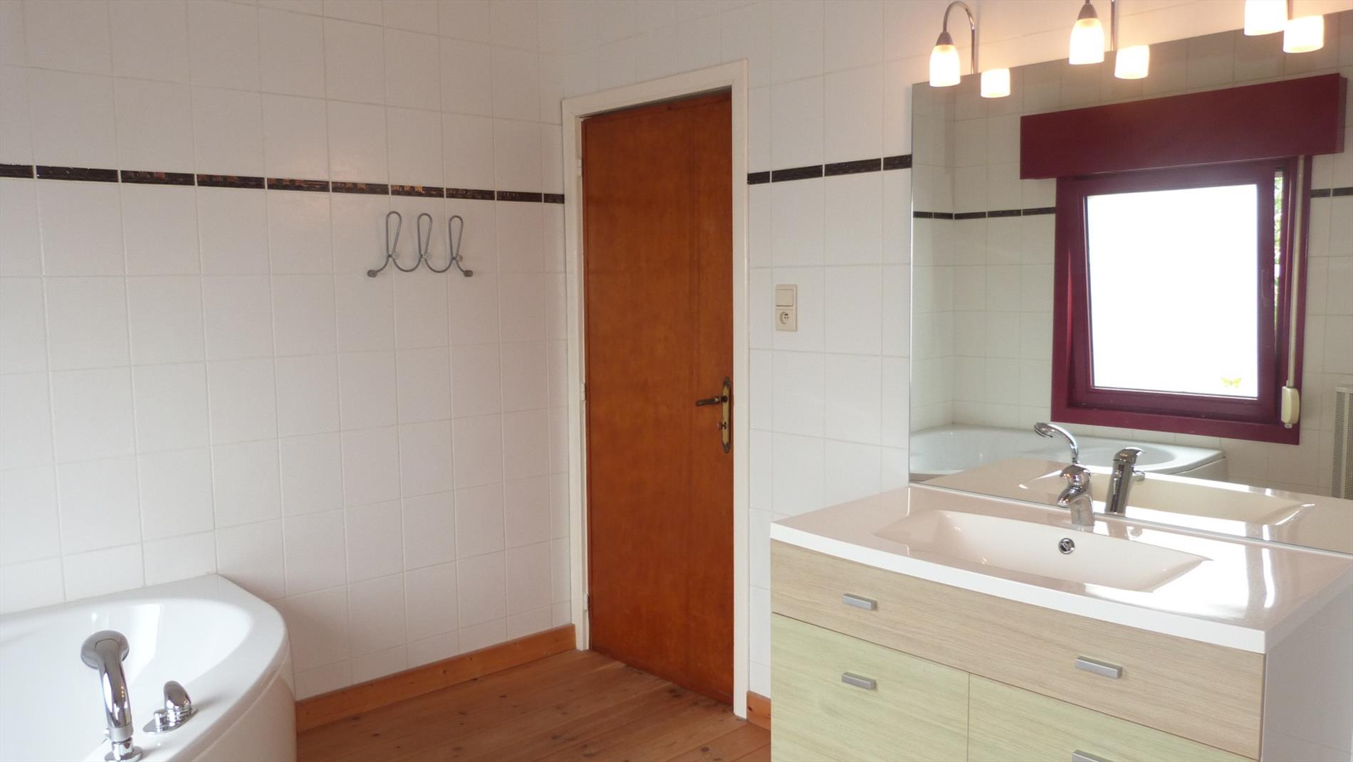 Verdiep: 1 slaapkamer en ruime badkamer: hoekbad, badkamermeubel met lavabo en toilet. Ruime zolderkamer = 2de slaapkamer. Tuin met overdekt terras,/veranda en aparte garage, inrit via Molenberg.