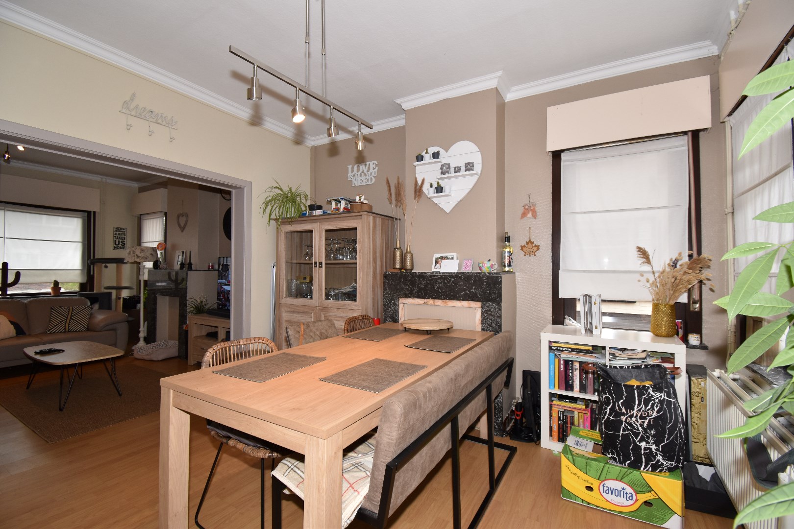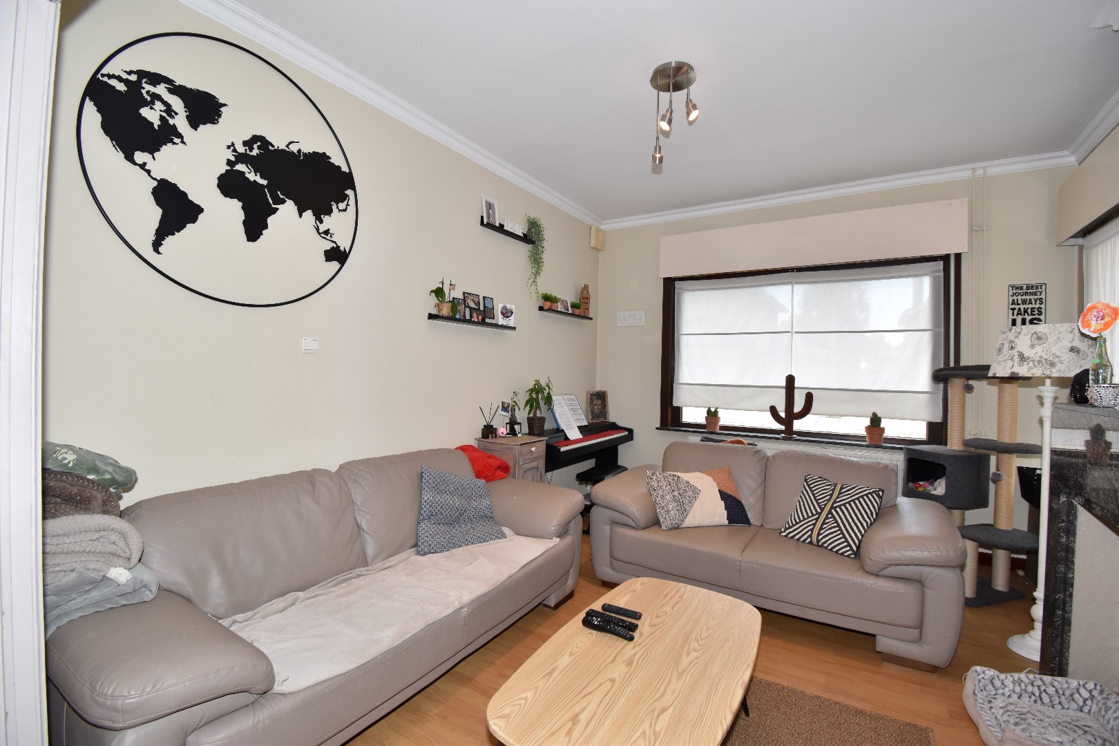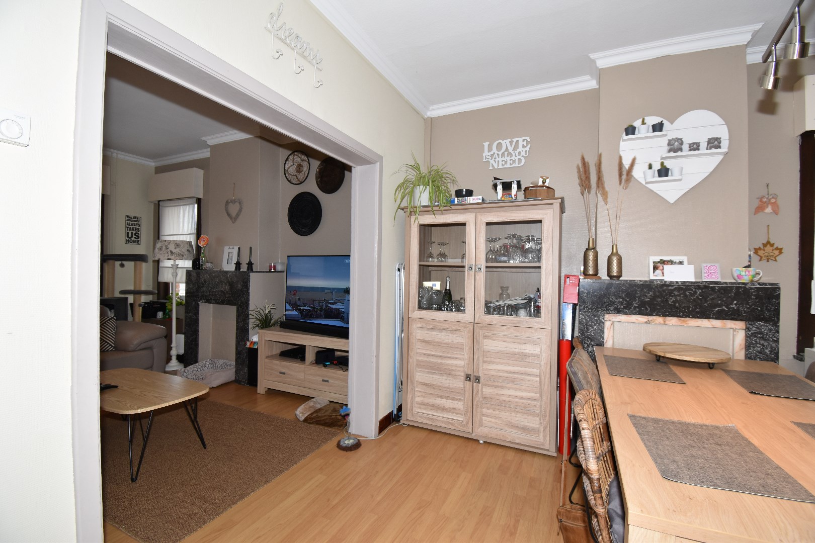 Indeling: inkom, living & salon, berging, keuken, badkamer met ligbad, badkamermeubel en toilet., wasplaats/CV ruimte. Op het 1ste verdiep zijn er 2 slaapkamers. De zolderruimte wordt momenteel gebruikt als 3de slaapkamer.