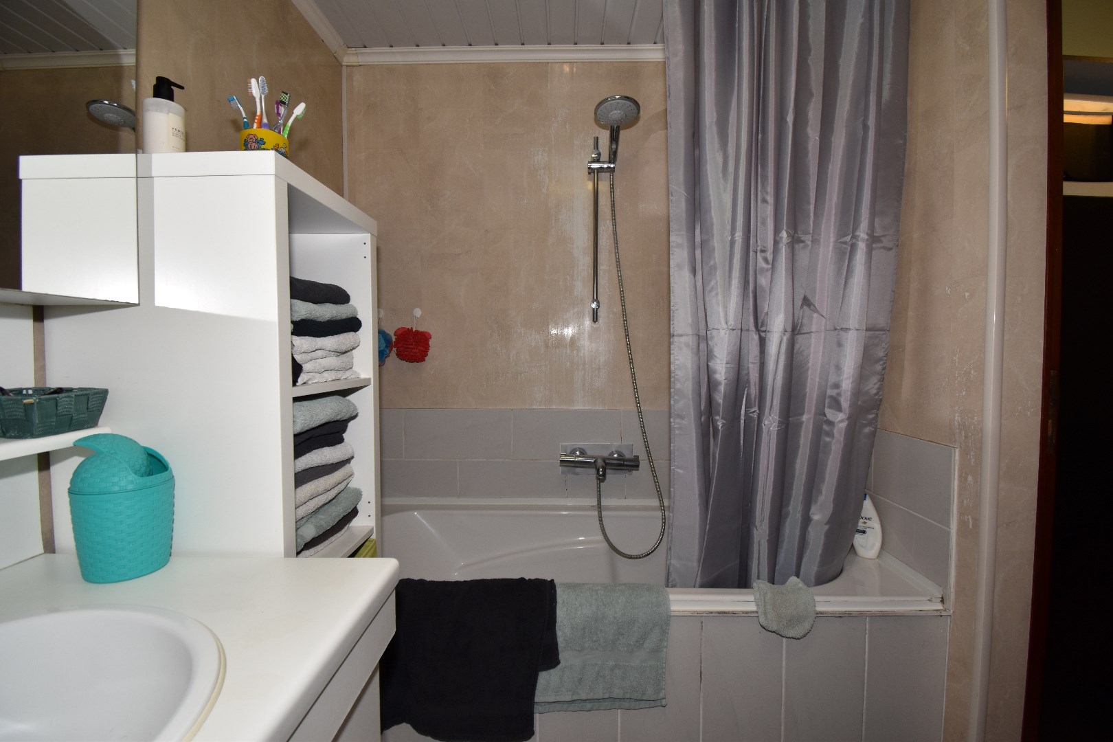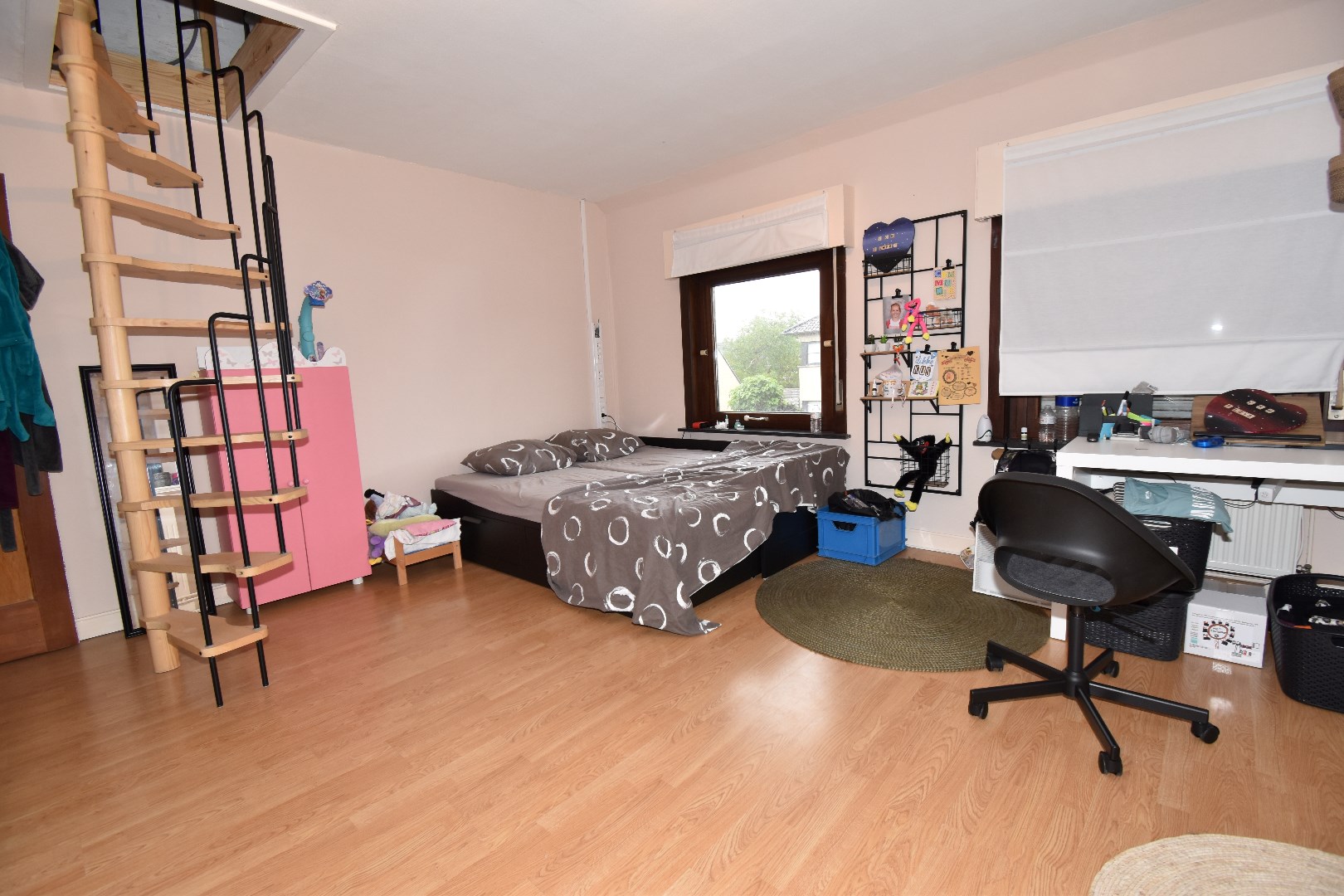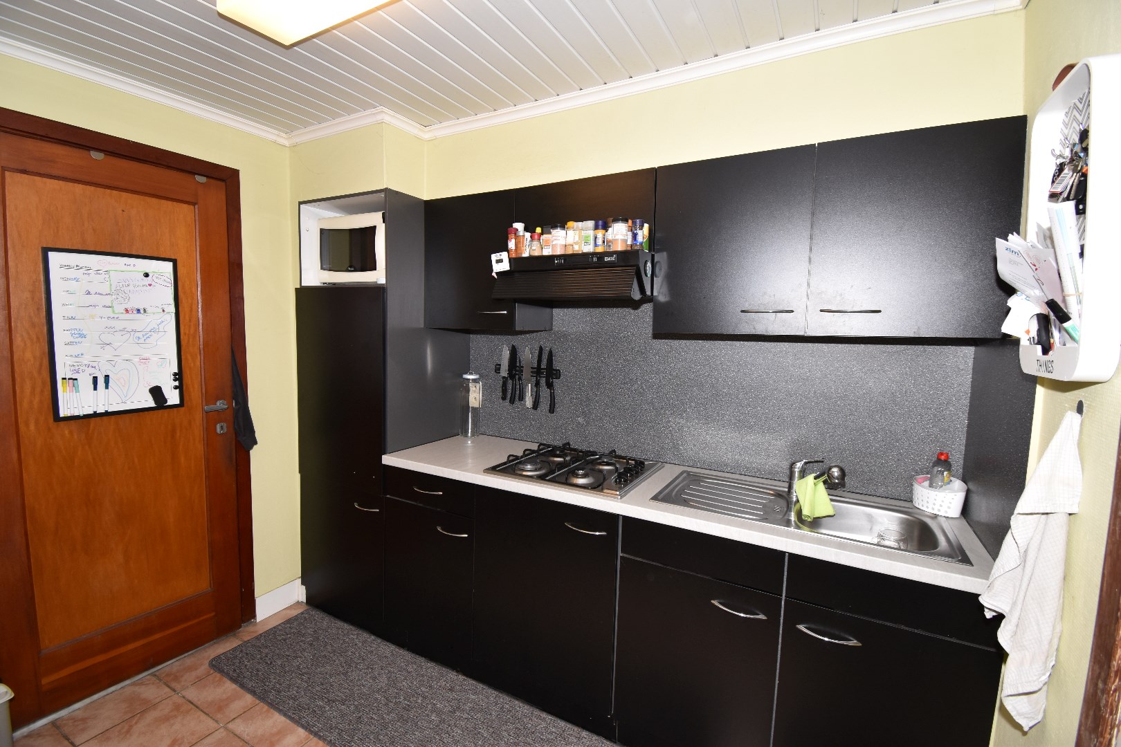 Indeling: inkom, living & salon, berging, keuken, badkamer met ligbad, badkamermeubel en toilet., wasplaats/CV ruimte. Op het 1ste verdiep zijn er 2 slaapkamers. De zolderruimte wordt momenteel gebruikt als 3de slaapkamer.