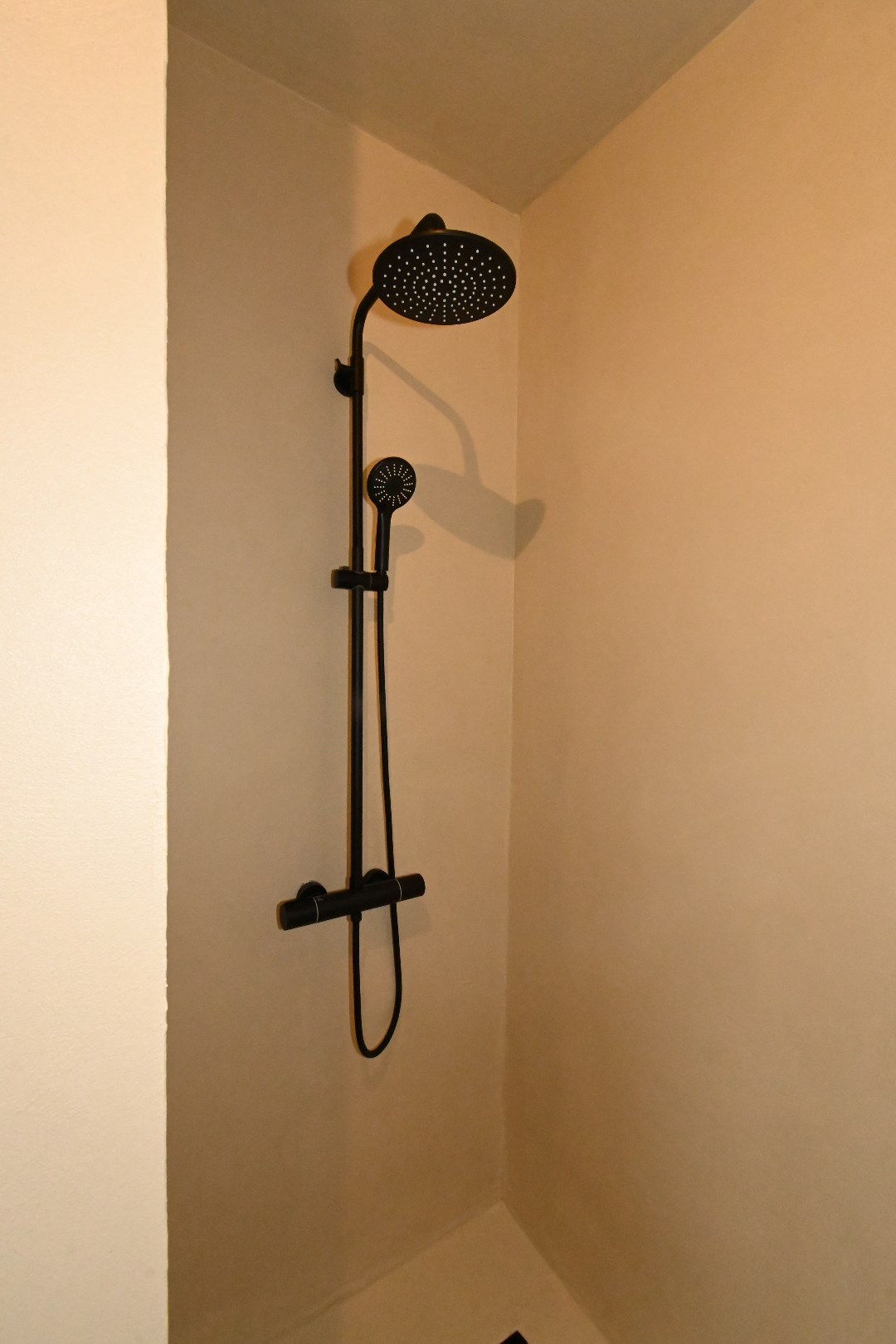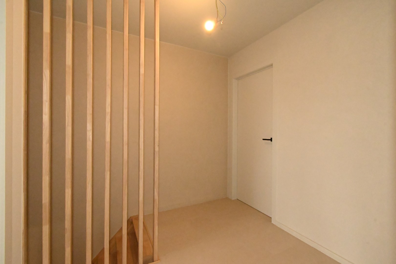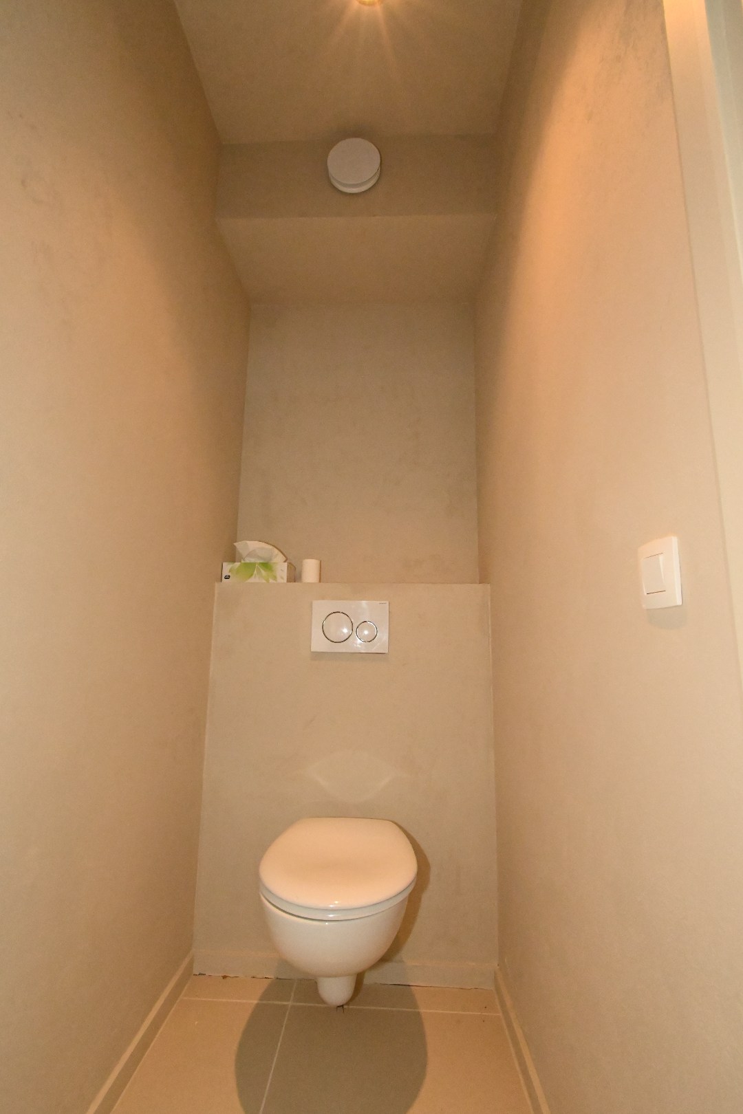 Nog op het gelijkvloers is er het afzonderlijk toilet en de badkamer met inloopdouche, lange wastafel met lavabo en een technische ruimte met het ventilatiesysteem en voorziening voor de wasmachine.