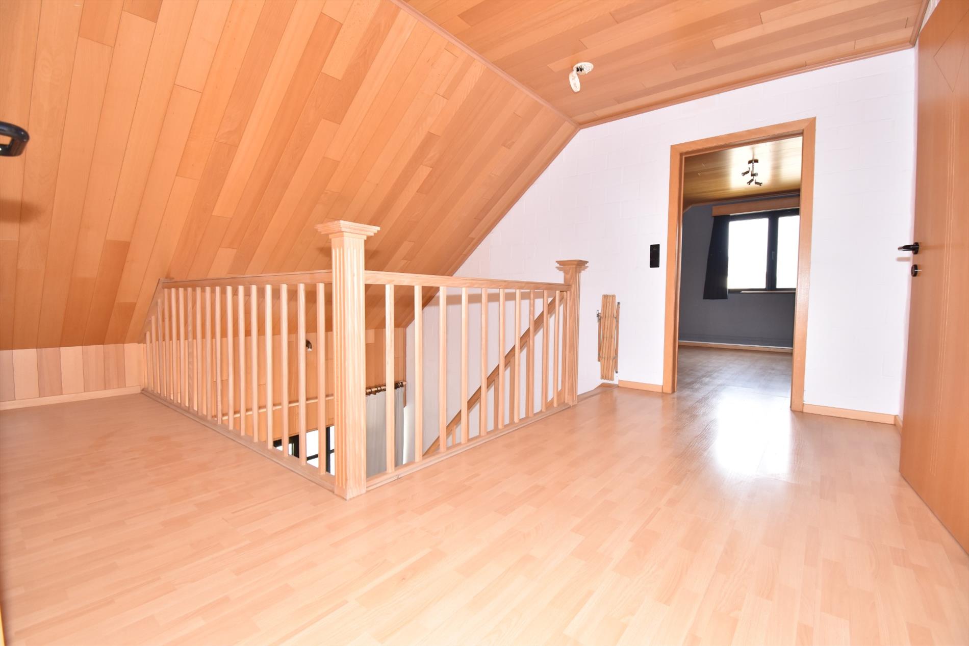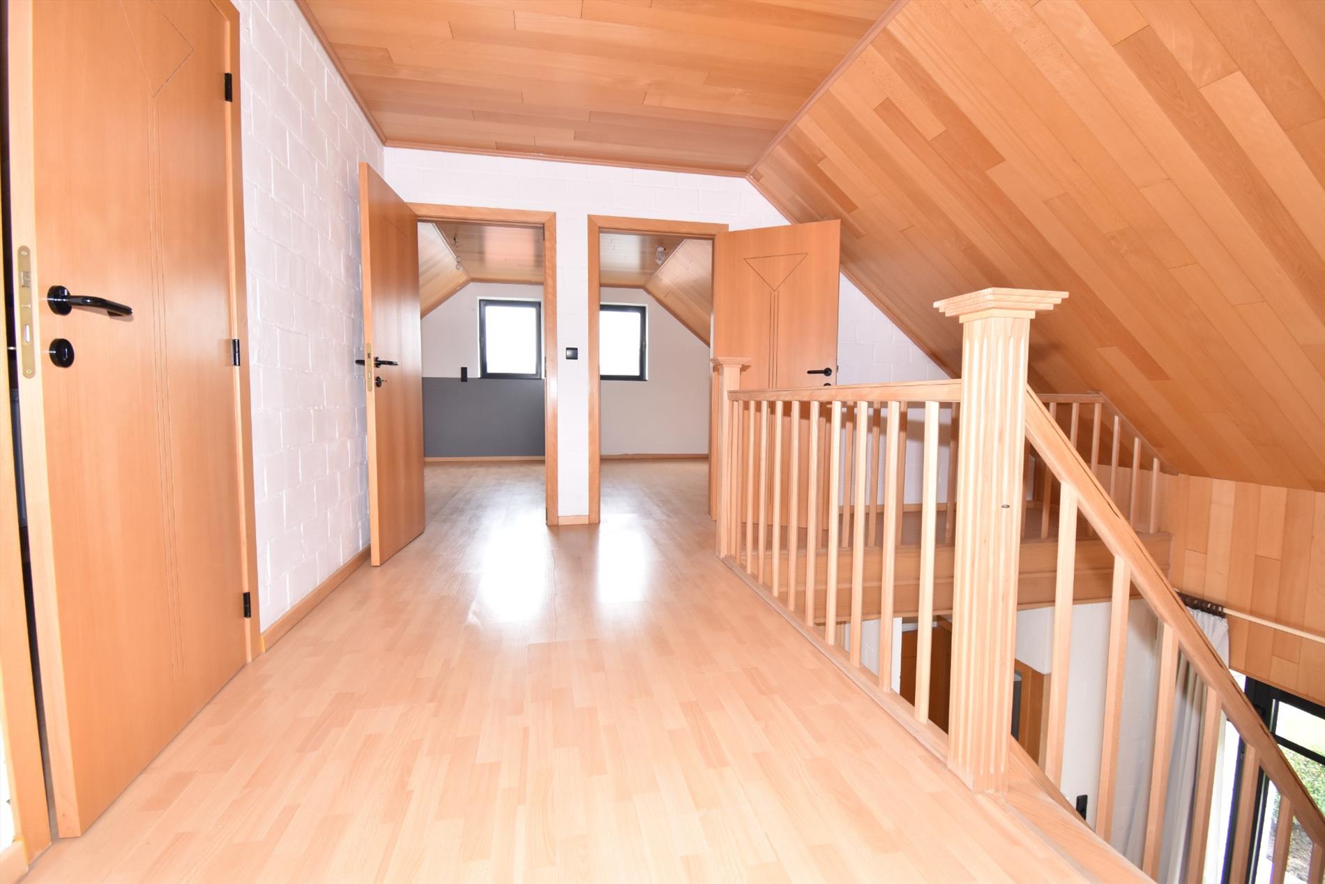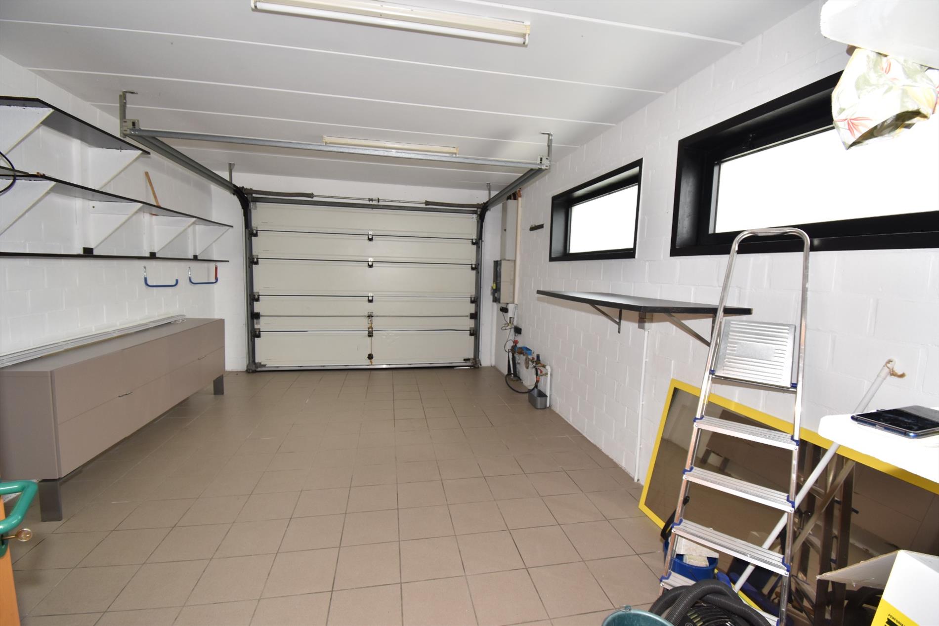 Indeling; op het gelijkvloers heeft men de inkom met gastentoilet, living en salon met aanpalend terras, ingerichte keuken, bureau/slaapkamer, badkamer met ligbad, douche, dubbele lavabo en toilet, berging en garage. Boven is er de nachthal met toegang tot de 3 slaapkamers en zolderruimte.