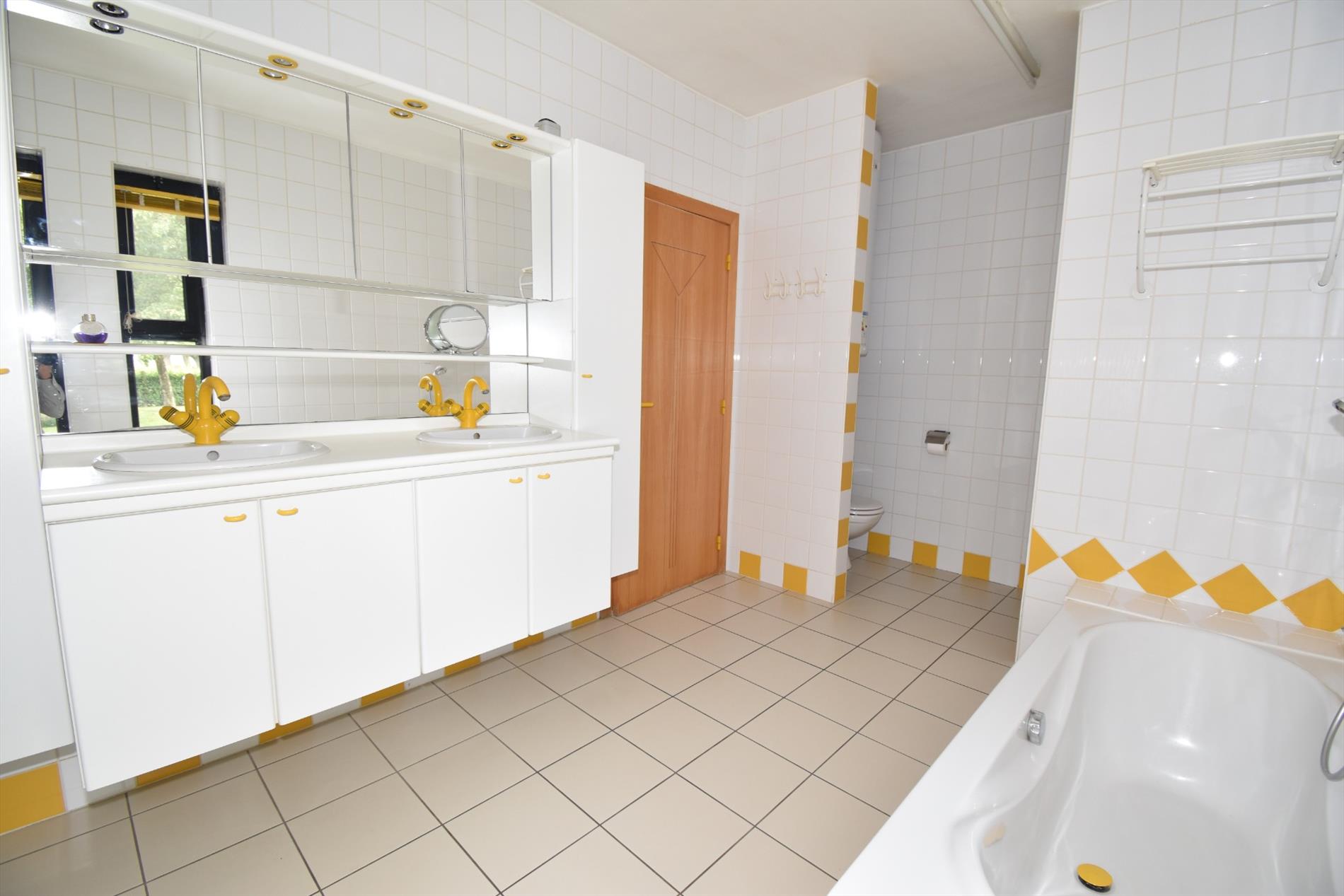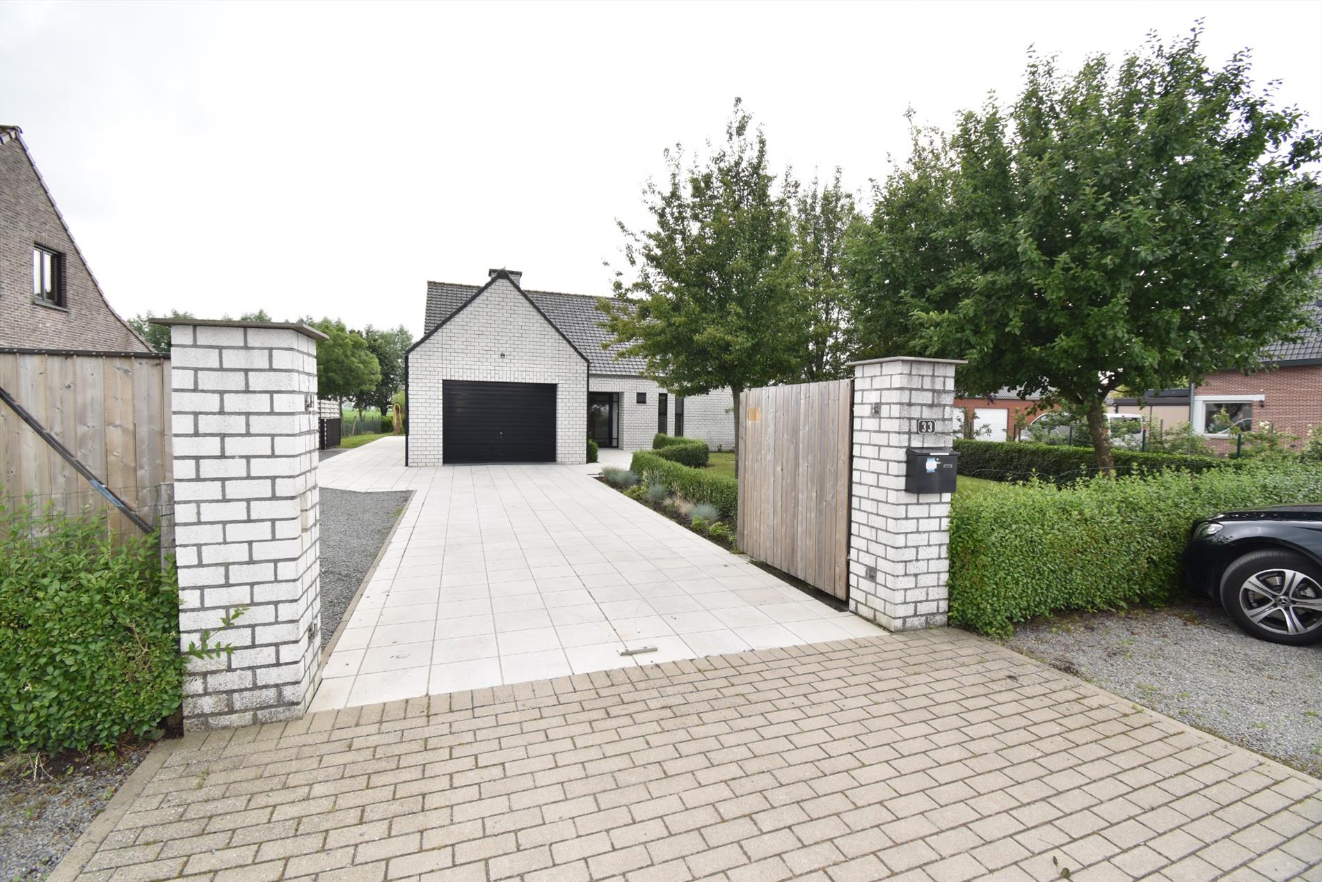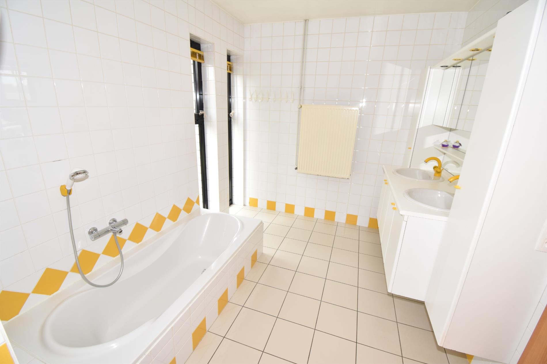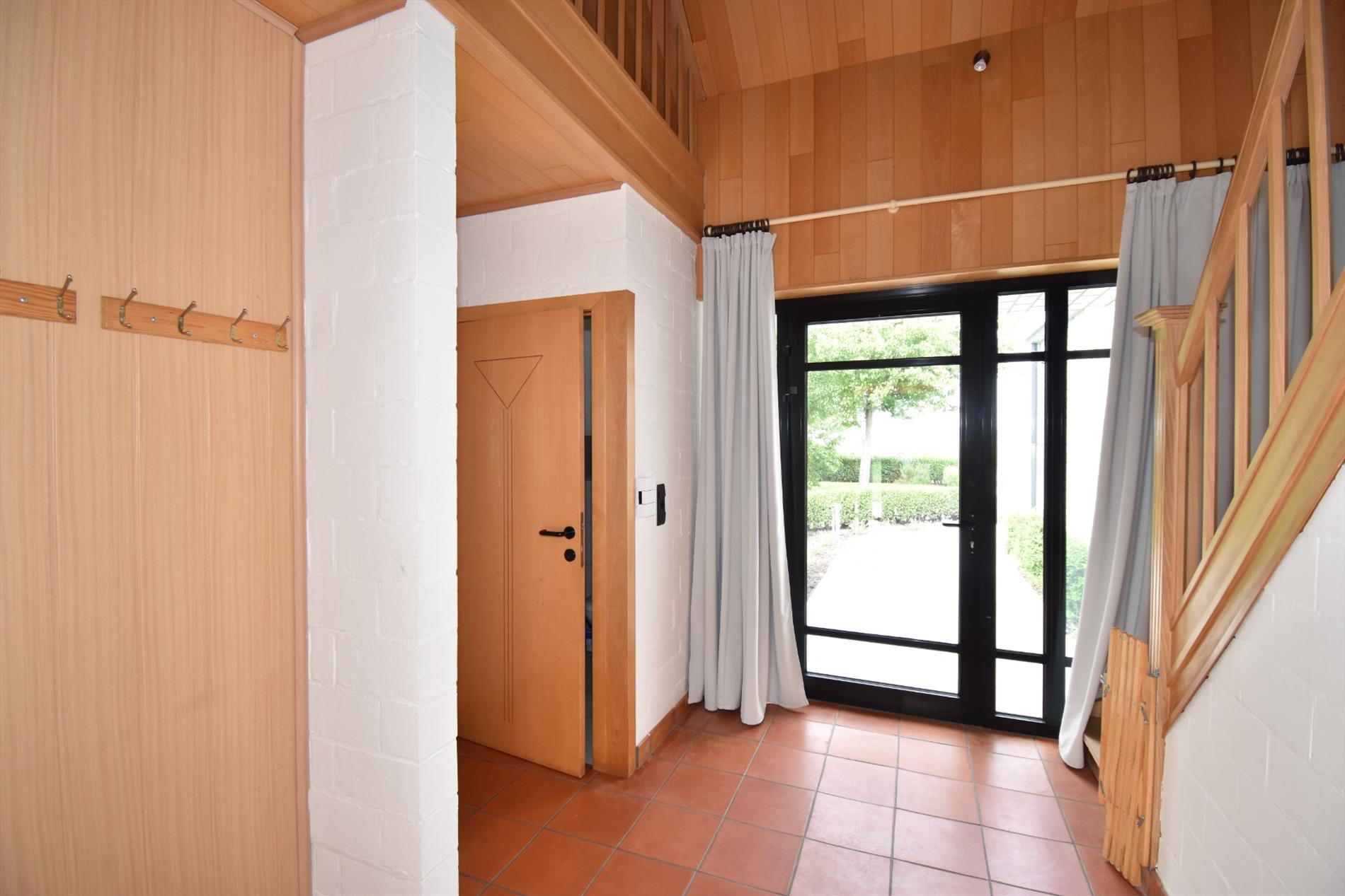 Indeling; op het gelijkvloers heeft men de inkom met gastentoilet, living en salon met aanpalend terras, ingerichte keuken, bureau/slaapkamer, badkamer met ligbad, douche, dubbele lavabo en toilet, berging en garage. Boven is er de nachthal met toegang tot de 3 slaapkamers en zolderruimte.