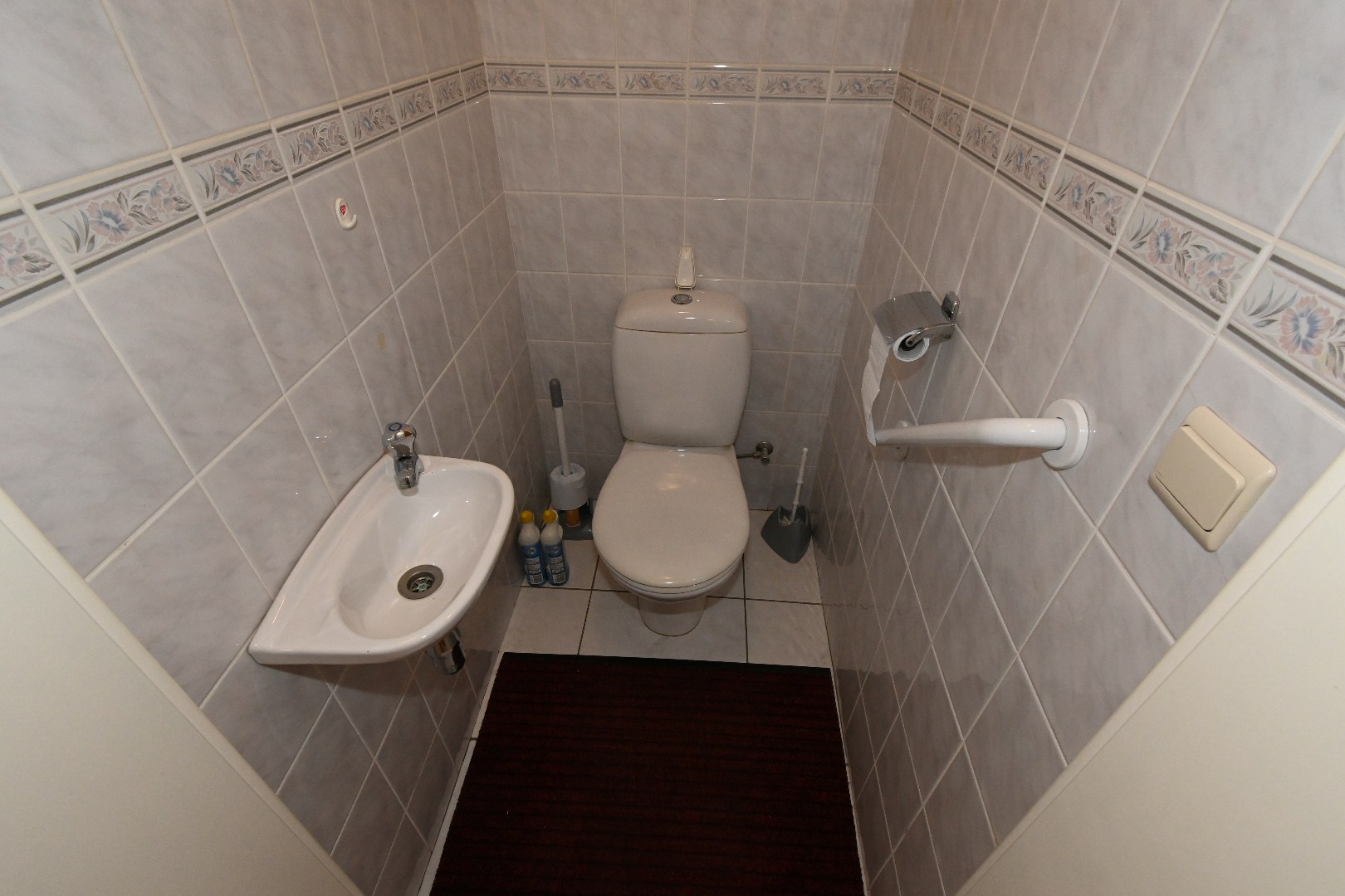 De badkamer met ligbad, bidet en een badkamermeubel met ingebouwde lavabo biedt voldoende opbergmogelijkheid. De betegeling tot aan het plafond is ook nog zeer onderhoudsvriendelijk.