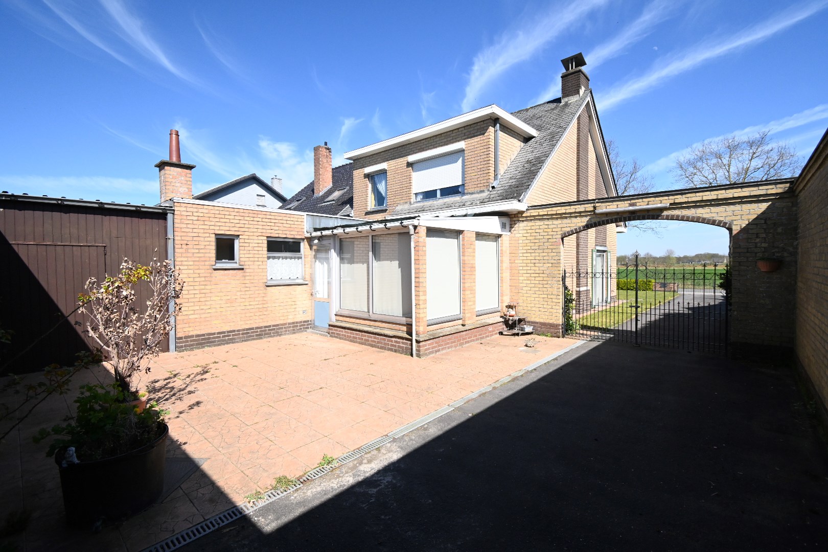 Op het ruime, zuidelijk gerichte terras achter de doorrijpoort met smeedijzer hek is het knus vertoeven afgeschermd van wind en passanten.