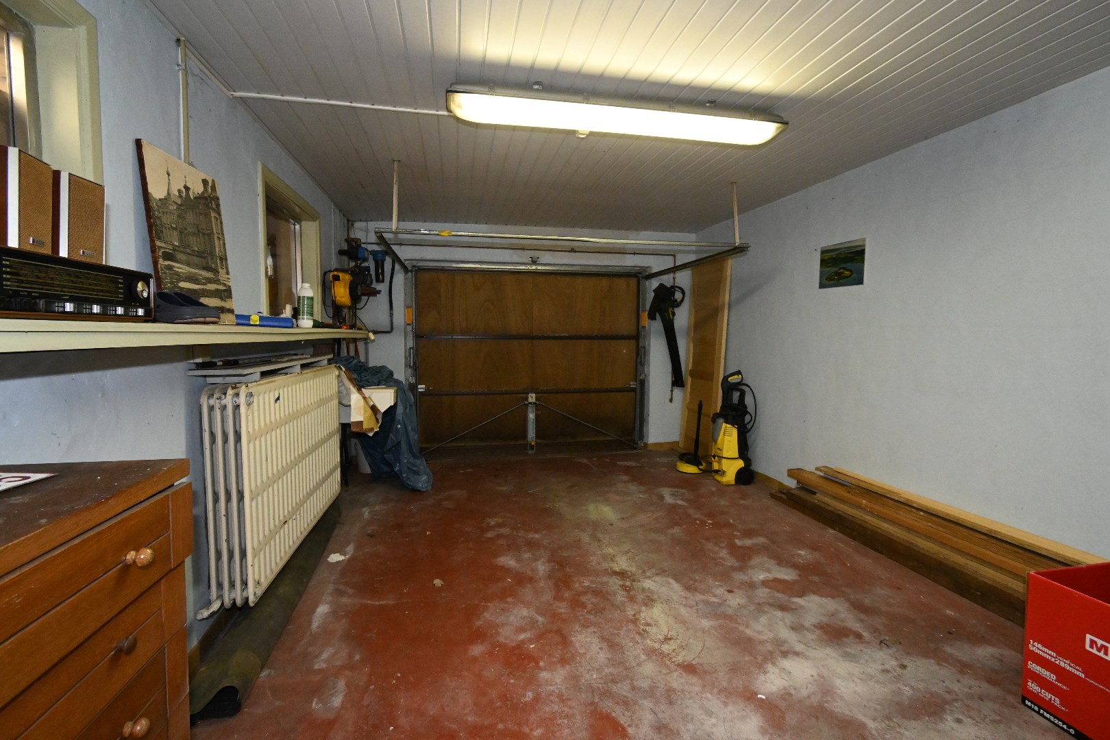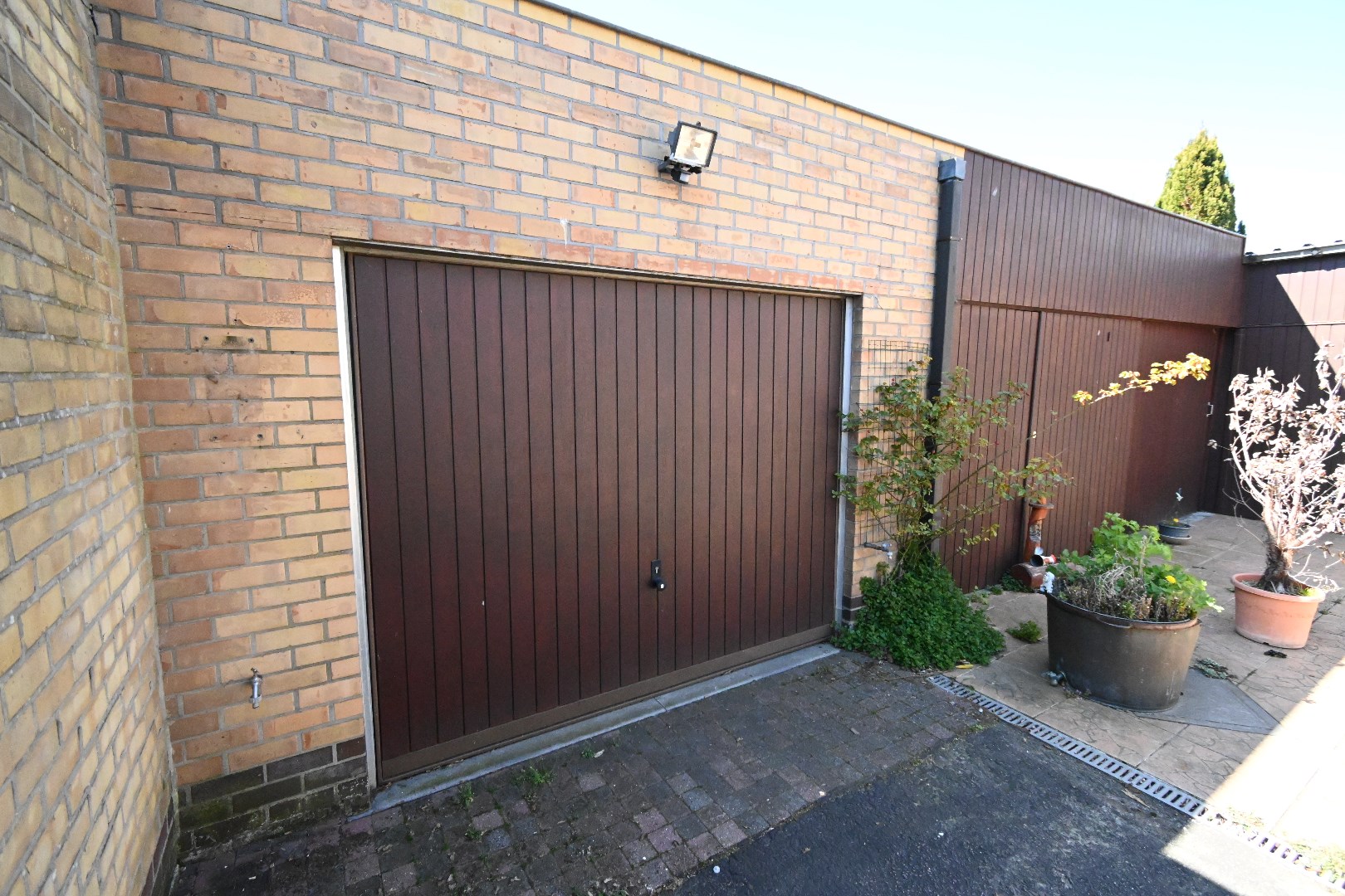 Achteraan naast de gemetste en verwarmde garage staan er over de hele breedte van het perceel bergruimten waar naar hartenlust kan verzameld en geknutseld worden.