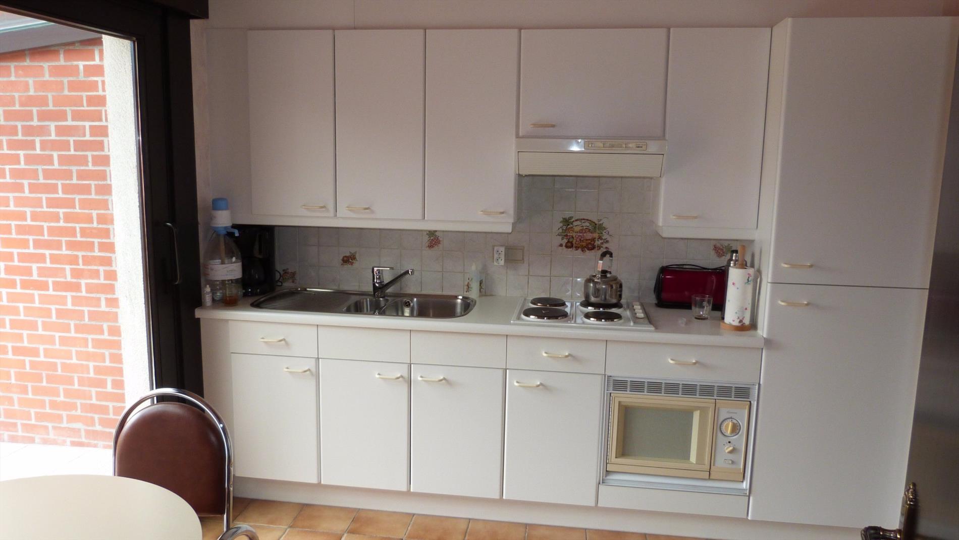 Vanuit de keuken kan men naar het overdekte terras en heeft men een mooi uitzicht op de tuin.
