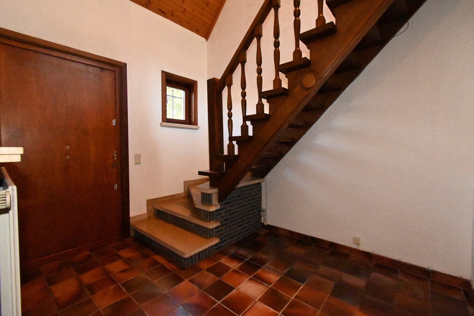 Langs de voordeur kom je in de inkom/traphal met toegang tot de L-vormige living met houtvuur.